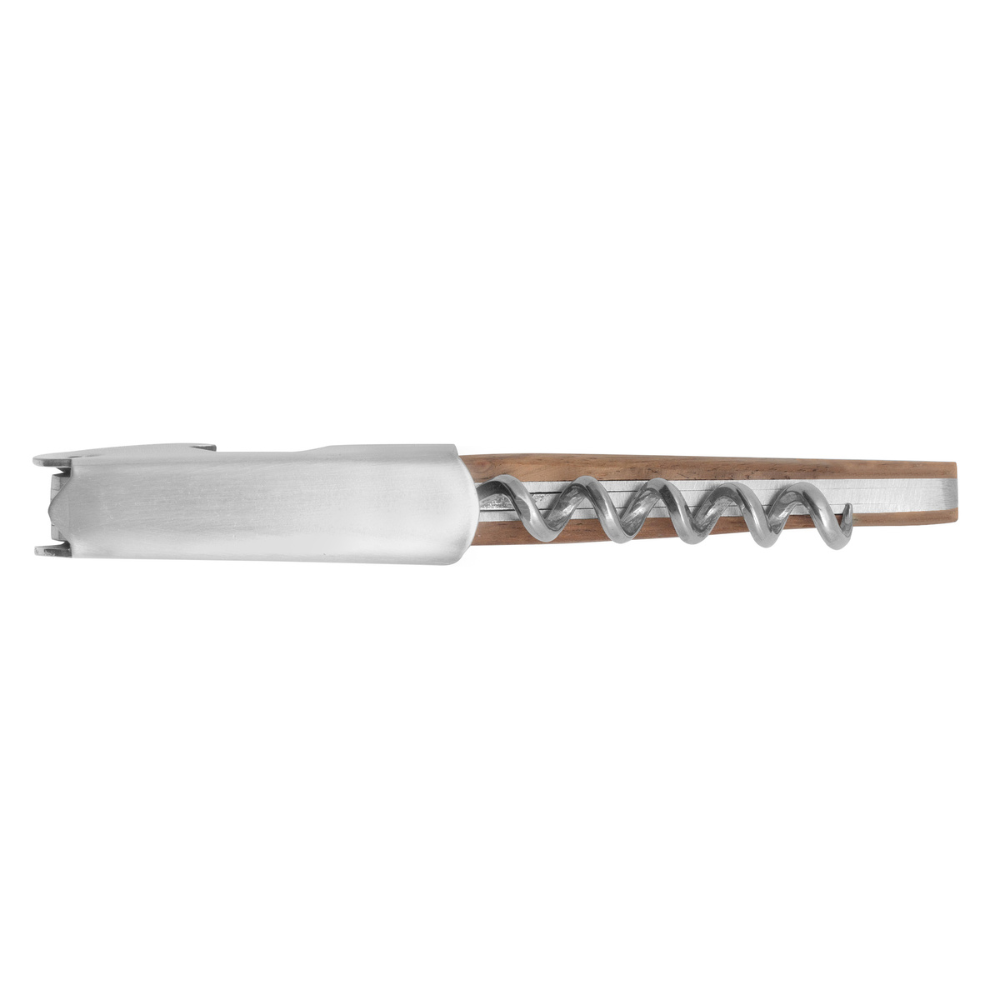 - Abridor de botellas de vino en acero inoxidable con mango de madera en color natural.